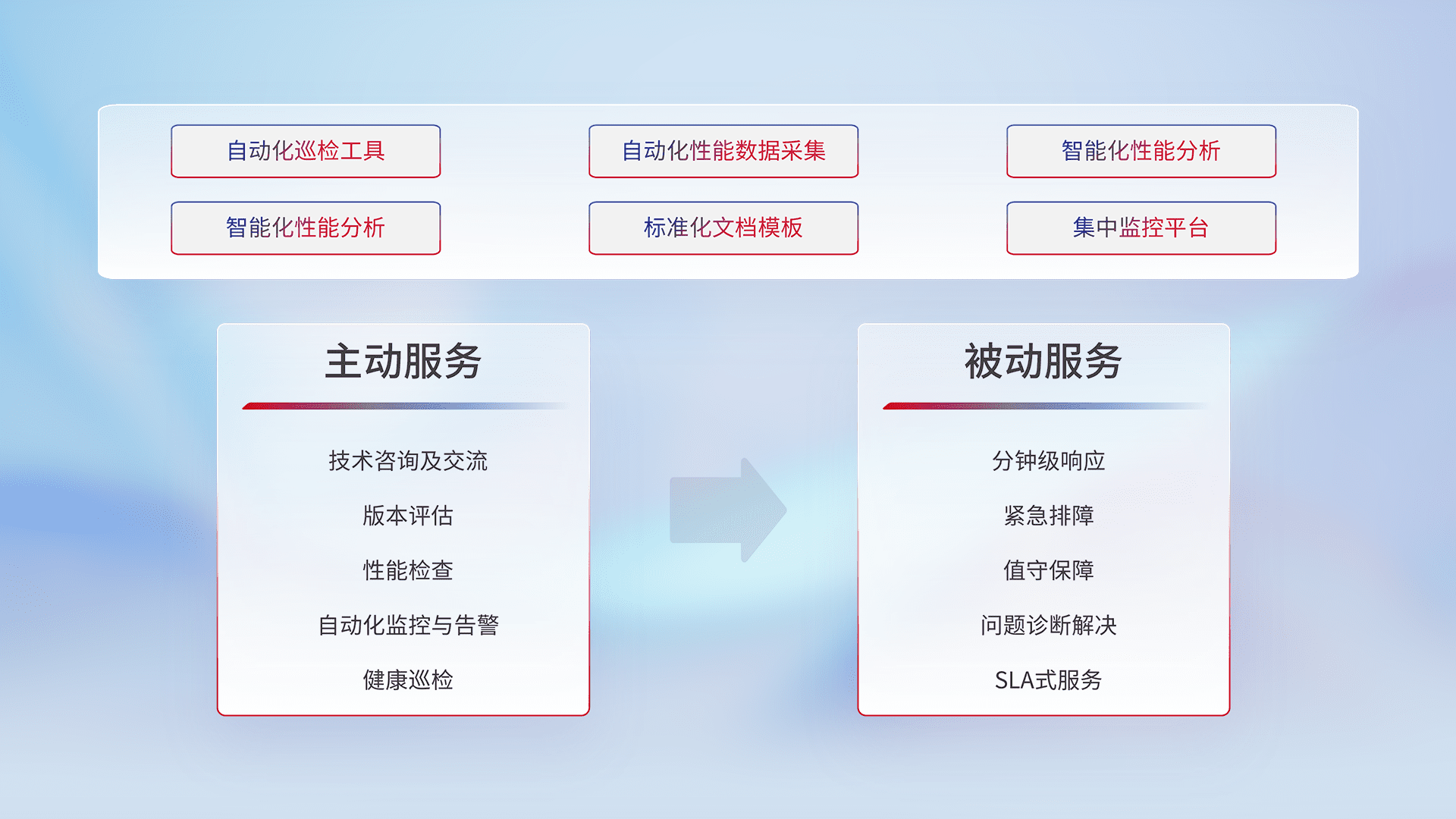 智能化工具和标准化文档,,,,保障服务质量,,提供主动服务(包含技术咨询、、版本评估、、、、性能检查、、、自动化监控与告警、、健康巡检)和被动服务包含(分钟级响应、、紧急排障、、、值守保障、、、、问题诊断解决、、、SLA服务)。。。。